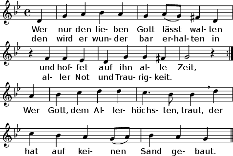 1. Wer nur den lieben Gott lässt walten und hoffet auf ihn allezeit, den wird er wunderbar erhalten in aller Not und Traurigkeit. Wer Gott, dem Allerhöchsten, traut, der hat auf keinen Sand gebaut.