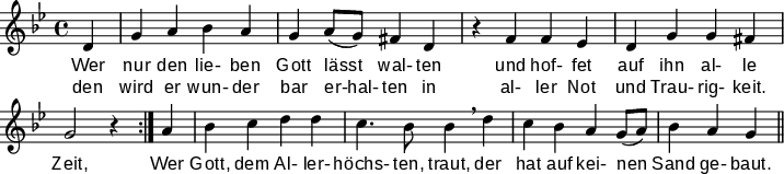 1. Wer nur den lieben Gott lässt walten und hoffet auf ihn allezeit, den wird er wunderbar erhalten in aller Not und Traurigkeit. Wer Gott, dem Allerhöchsten, traut, der hat auf keinen Sand gebaut.